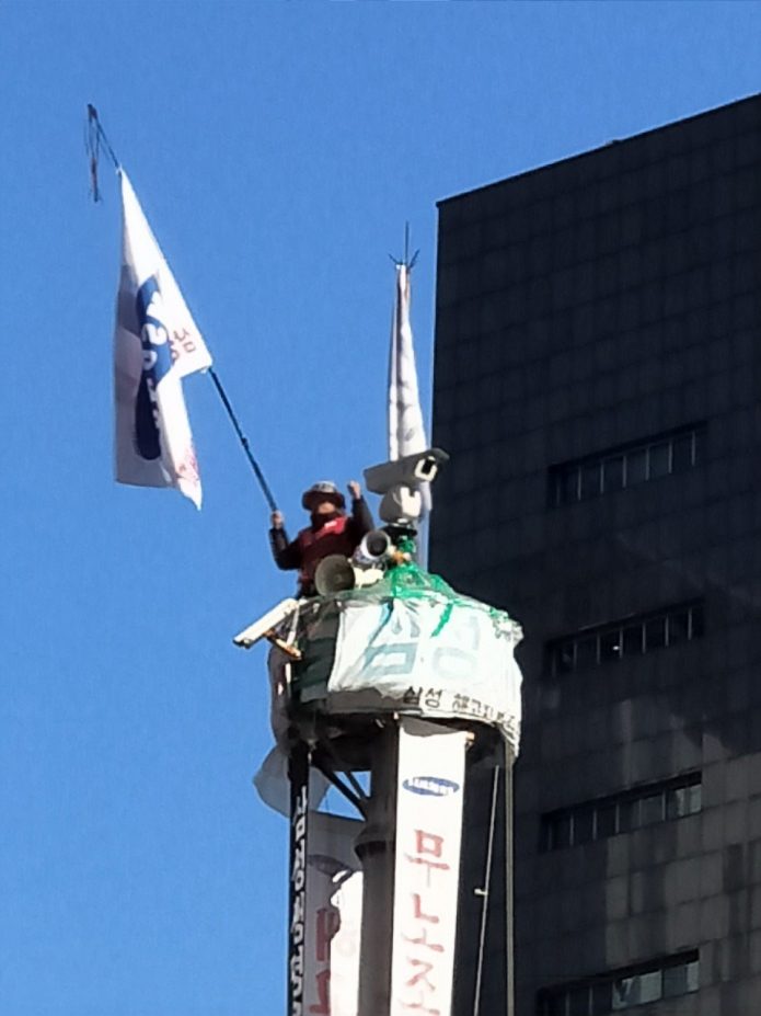 金永熙冤屈地遭受不當解雇24年後,在他即將屆齡退休的前一個月,為抗議三星的惡質高壓,決定登上首爾地鐵江南站(三星集團總部所在地)前的CCTV塔台上進行高空抗爭,截至我們去聲援的這天(11/09),他本人已經持續在塔上153天,完全沒有下來。李在容則是在地面搭棚,與金永熙同志一起站出來,控訴三星財閥如何傲慢且粗暴的對待勞工。